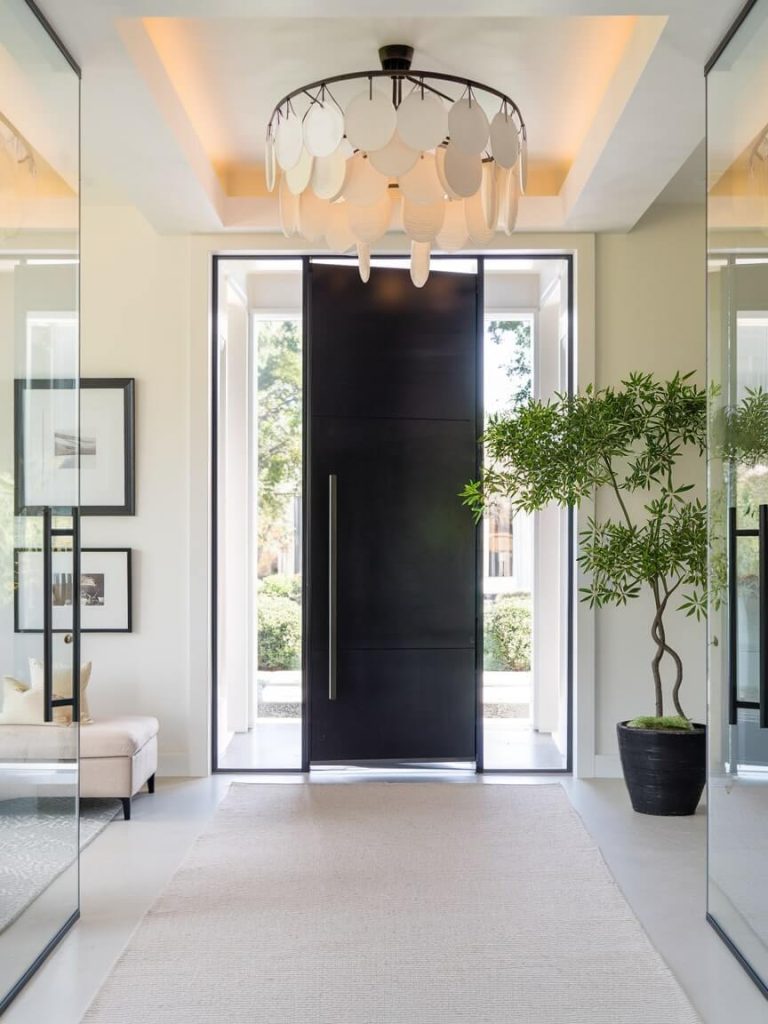 The first entryway embraces a sleek, minimalist design, featuring a black door as the focal point and framed art strategically placed on the wall. The use of neutral tones, coupled with a pop of greenery from the potted plant, exudes sophistication while maintaining a warm welcome. This design is perfect for those who love clean lines and a serene aesthetic. The minimalist approach ensures the picture wall doesn’t overwhelm but complements the space effortlessly.