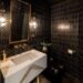 A modern four-poster bed steals the spotlight in this sophisticated farmhouse retreat. The sleek black frame pairs flawlessly with plush, layered bedding and luxurious faux fur throws, striking the right balance between elegance and comfort. Matte black walls form a moody backdrop that enhances the room’s dramatic tone.