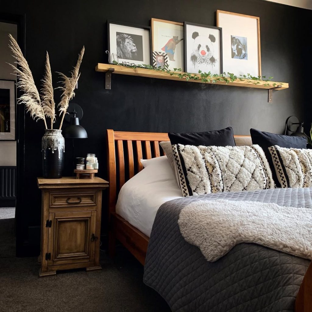 This bedroom captures the dramatic elegance of farmhouse design by contrasting deep black walls with rich wooden textures. The wooden bed frame grounds the space with natural warmth, while the moody wall behind it adds depth and sophistication. A rustic wooden shelf adorned with greenery and art prints injects personality, giving the space a curated and lived-in feel.