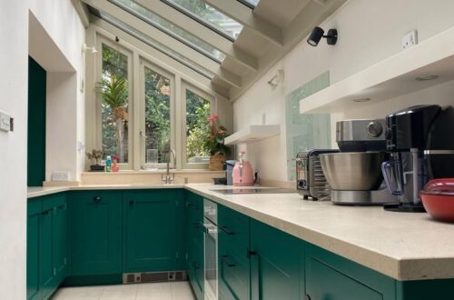 A built-in wine fridge and open shelving add everyday convenience, making this kitchen as functional as it is beautiful. The palette and layout make it perfect for relaxed gatherings and effortless elegance in open-plan homes.