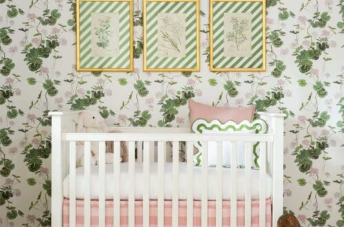 Blending timeless style with a playful edge, this nursery uses sage-toned beadboard to add richness and color below the floral wallpaper. The upper wall’s delicate print brings in lightness and movement, while brass accents and natural wood finishes deliver depth and elegance.