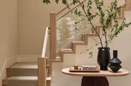 To achieve this look, install a bench fitted exactly into the nook beneath your stairs. Style it with tailored cushions and dried botanicals for an upscale touch. It’s a compact, stylish way to integrate seating and décor into architectural nooks.