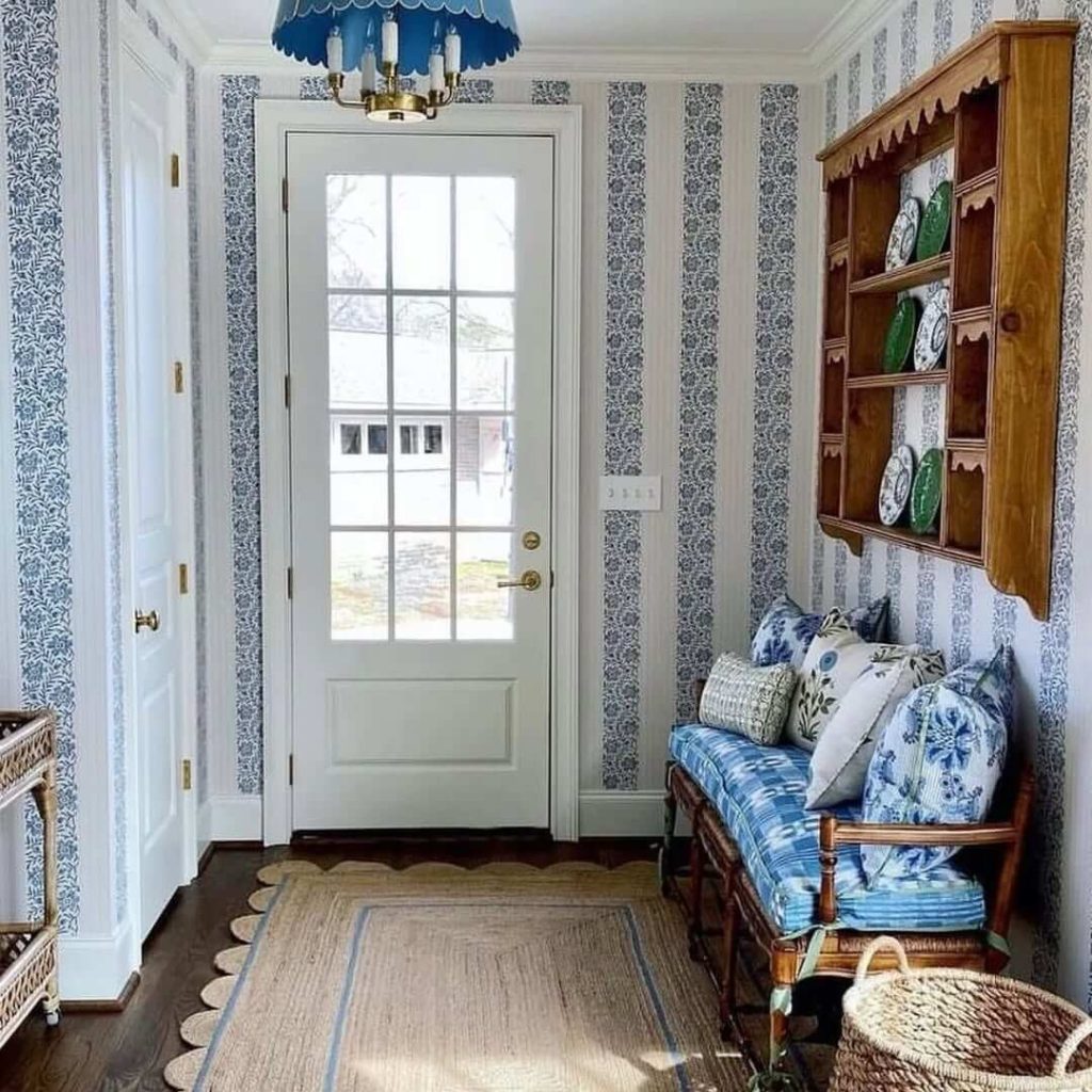 This cheerful entryway brings beachy energy indoors with a rattan bench layered in blue-and-white cushions. A striped wallpaper backdrop adds playful dimension, while the wooden shelf above offers room for decor or practical storage. The soft blue pendant light overhead anchors the look with a coastal nod.