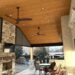 With its long layout and clean white siding, this porch offers the quintessential modern farmhouse look. Black rocking chairs and hanging fans are both decorative and practical, while red geraniums in window boxes offer cheerful contrast.