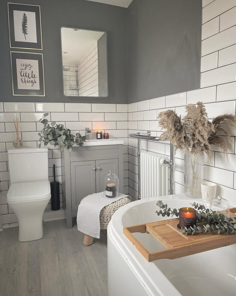 This bathroom embraces a gentle grey cabinet as the focal point, softened by layers of greenery and natural textures. A soft sage wall pairs beautifully with subway tiles and wood-framed decor, evoking a calm, earthy mood. Pampas grass and eucalyptus add a sense of serenity.