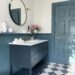 Inject vibrancy into your guest bathroom with bold navy walls and contemporary terrazzo tiles underfoot. This design offers a strong visual contrast, with a white vanity and an arched mirror softening the intensity of the blue. A rainfall showerhead and clean finishes contribute to a luxurious atmosphere.