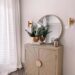 A round mirror, dried flowers, and warm lighting enhance the room’s atmosphere, making it feel both grounded and thoughtfully styled—a perfect blend of countryside charm and modern design.