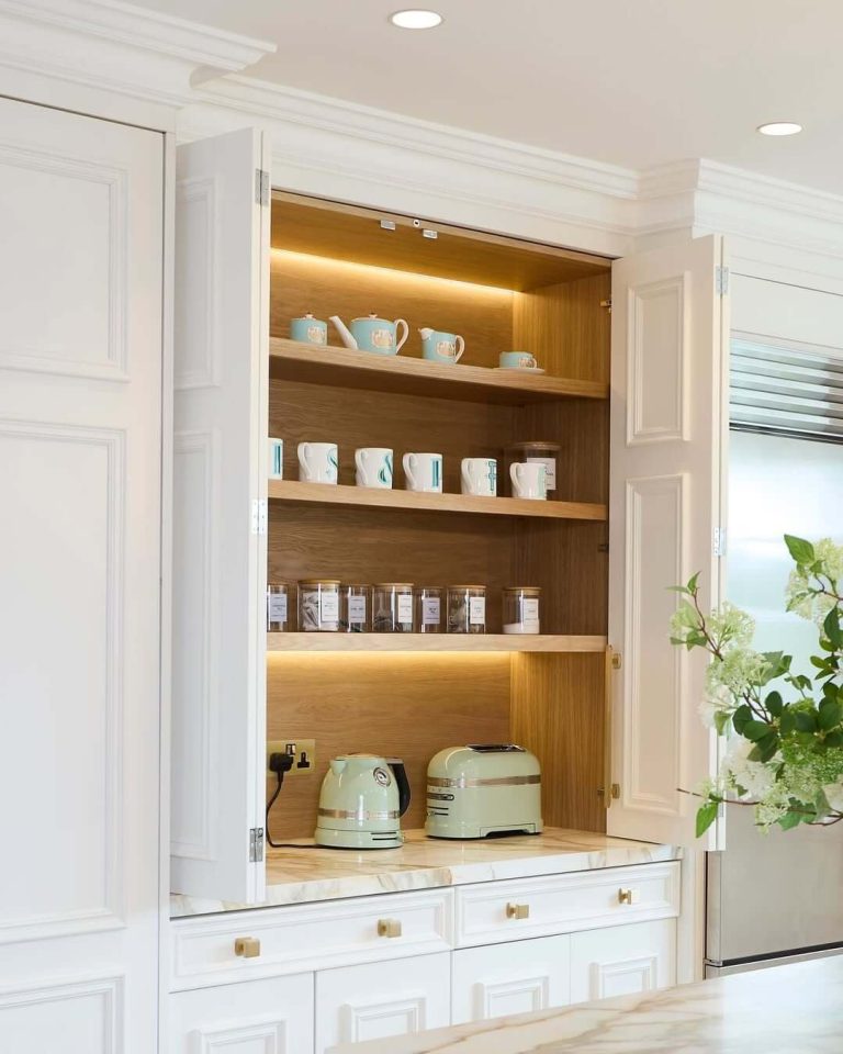 This design cleverly incorporates a hidden nook for small appliances, striking a perfect balance between practicality and aesthetics. Behind sleek white cabinet doors lies a warm wooden interior that creates a cozy contrast, instantly transforming a utilitarian corner into a design feature. The integrated lighting ensures visibility and ambiance, making this nook not only accessible but also visually pleasing.