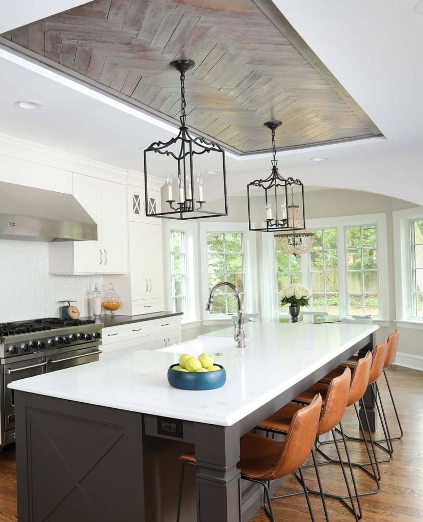 Chevron-patterned wood inlay within a recessed ceiling adds stylish texture and motion to a transitional kitchen. The dark wood draws the eye upward, providing contrast to bright cabinetry and surfaces. Rustic lantern-style pendant lighting enhances the ambiance with warm illumination and a nostalgic flair.