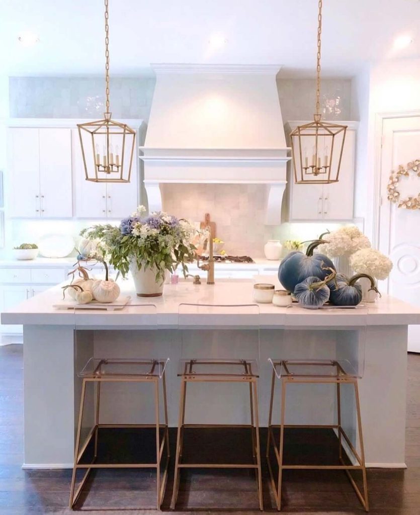 The gold pendant lights above and transparent barstools tie in a soft glam aesthetic that’s perfect for autumn or festive gatherings. The result is a sophisticated setup that embraces seasonal decor without compromising elegance or cohesion.